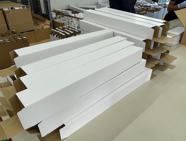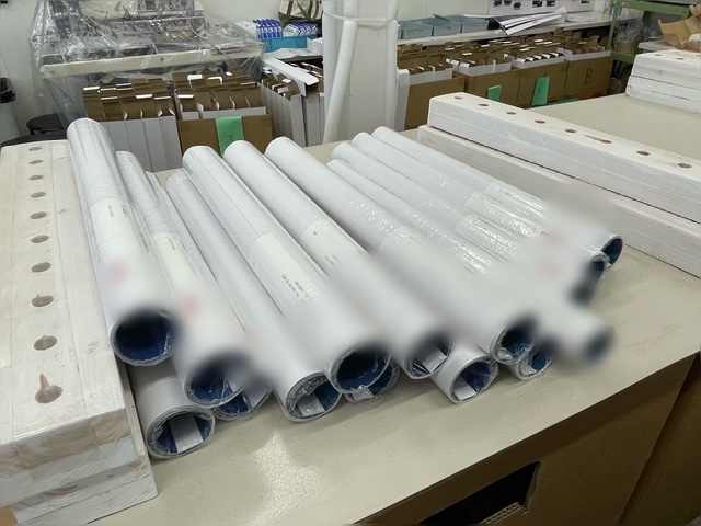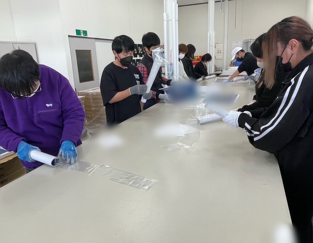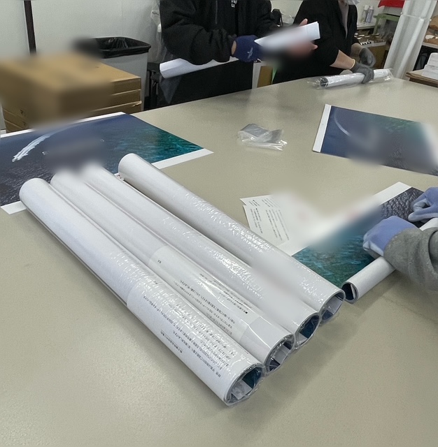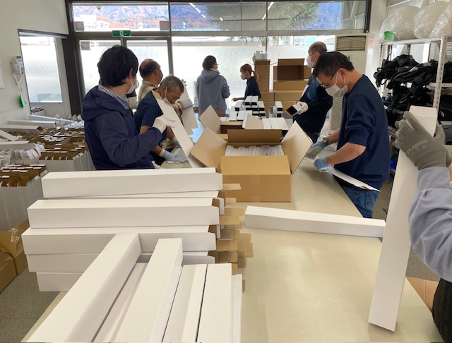 来年のカレンダー3種類、総数9,137部の梱包作業に取りかかりました。作業用手袋をはめ、汚れやキズ、指紋等がつかないよう丁寧に作業をしています。筒が長くて組み立てるのが大変だったり、袋を破かないよう気を付けたりと皆さんそれぞれ一生懸命取り組んでいます。